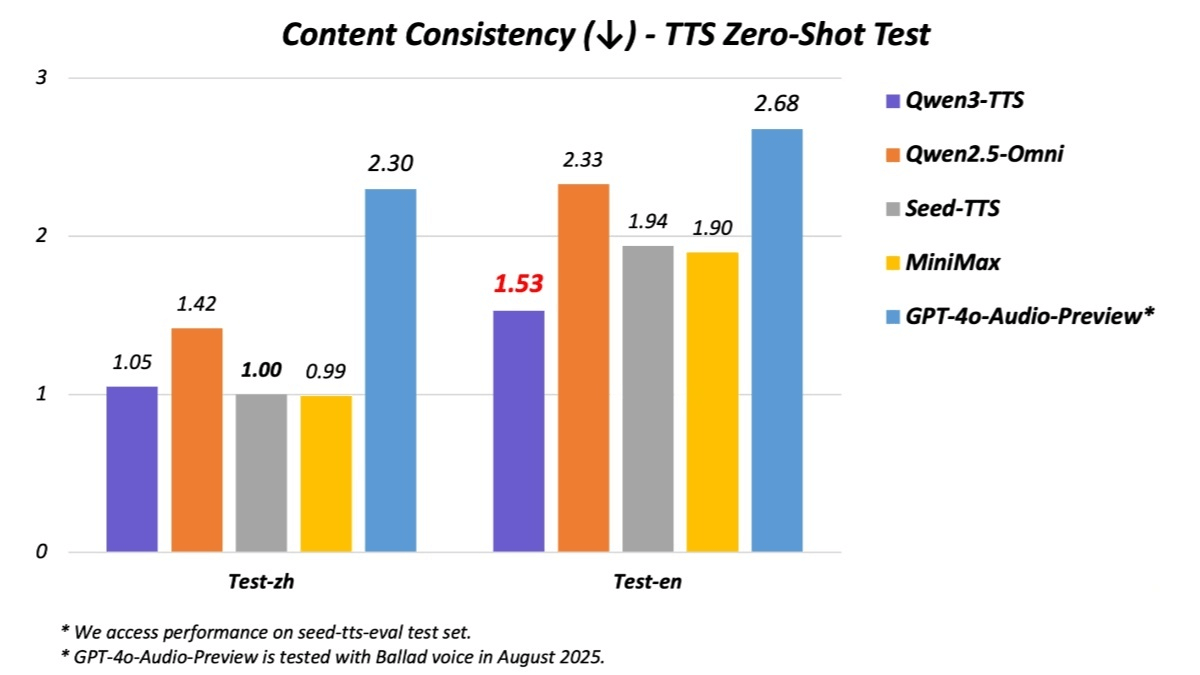 Multilingual stability: On the MiniMax TTS multilingual test set, Qwen3-TTS-Flash reached SOTA in WER (Word Error Rate) for Chinese, English, Italian, and French, significantly surpassing MiniMax, ElevenLabs, and GPT-4o-Audio-Preview.