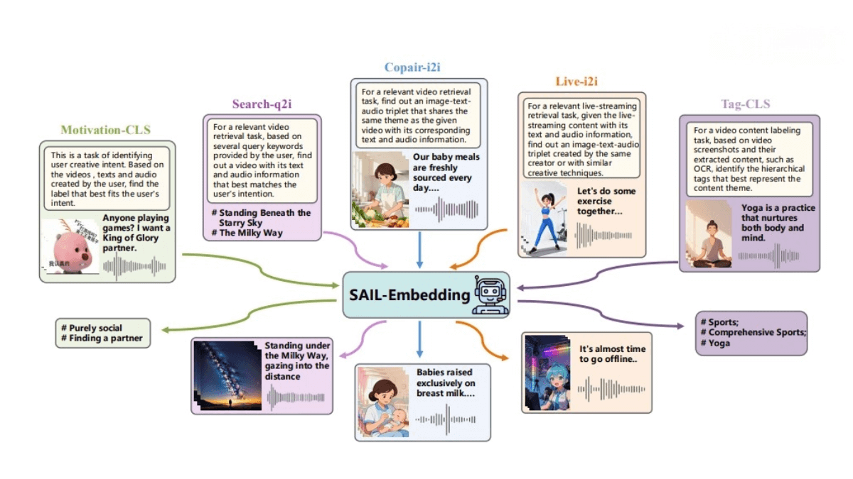 Through techniques such as dynamic hard negative mining and adaptive multi-source data balancing, SAIL-Embedding enhances training robustness and scalability. It leverages large language models (LLMs) as the backbone for reasoning and multimodal fusion, allowing flexible integration of modalities. Across multiple benchmarks, SAIL-Embedding significantly outperforms other methods, especially in search and collaborative perception scenarios.