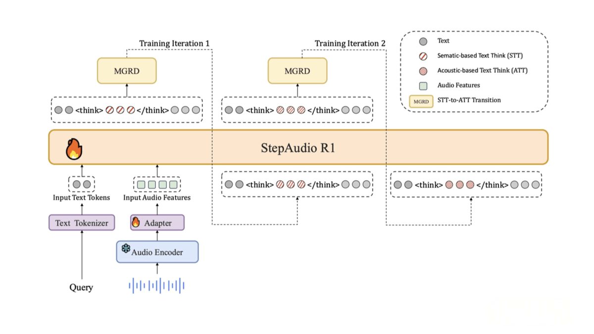 The core technology of StepAudio R1 is MGRD, which iteratively distills reasoning ability from textual abstraction into acoustic attributes.