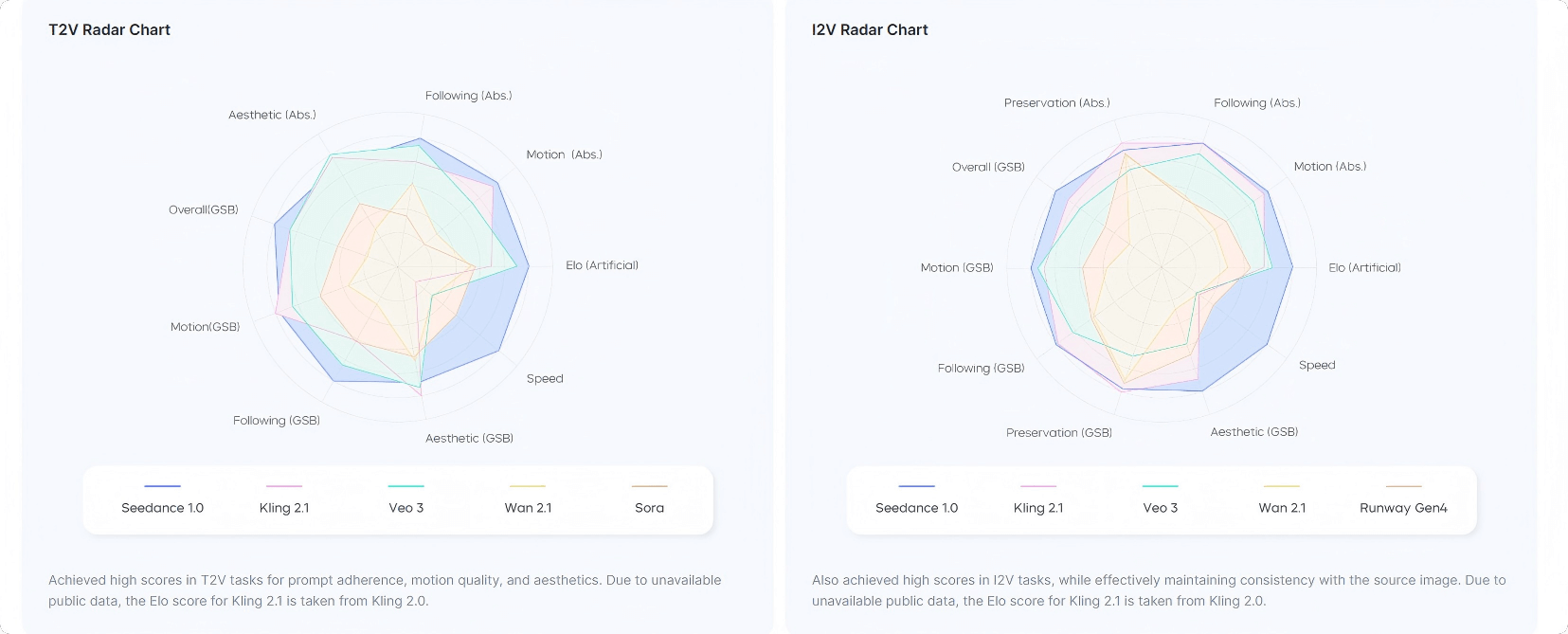 In internal benchmark comparisons, Seedance 1.0 performs exceptionally across multiple dimensions such as instruction following, motion quality, and aesthetics—especially in T2V tasks.