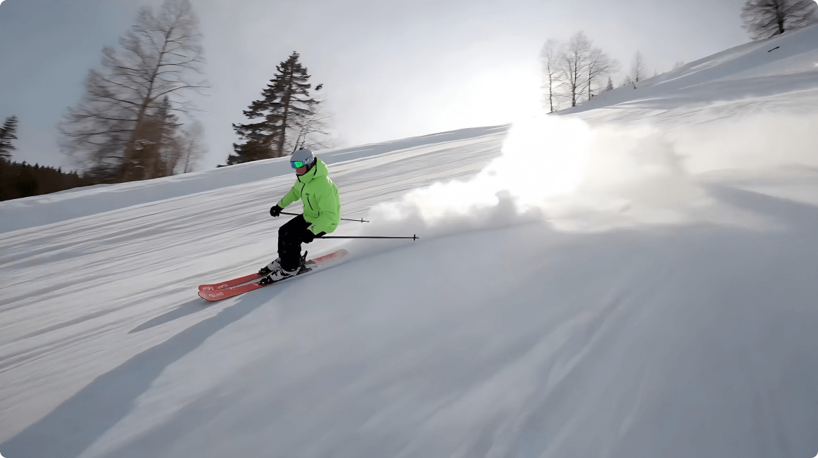 Prompt: A skier is skiing. As he turns, a large spray of snow rises. He accelerates down the slope while the camera smoothly tracks him.